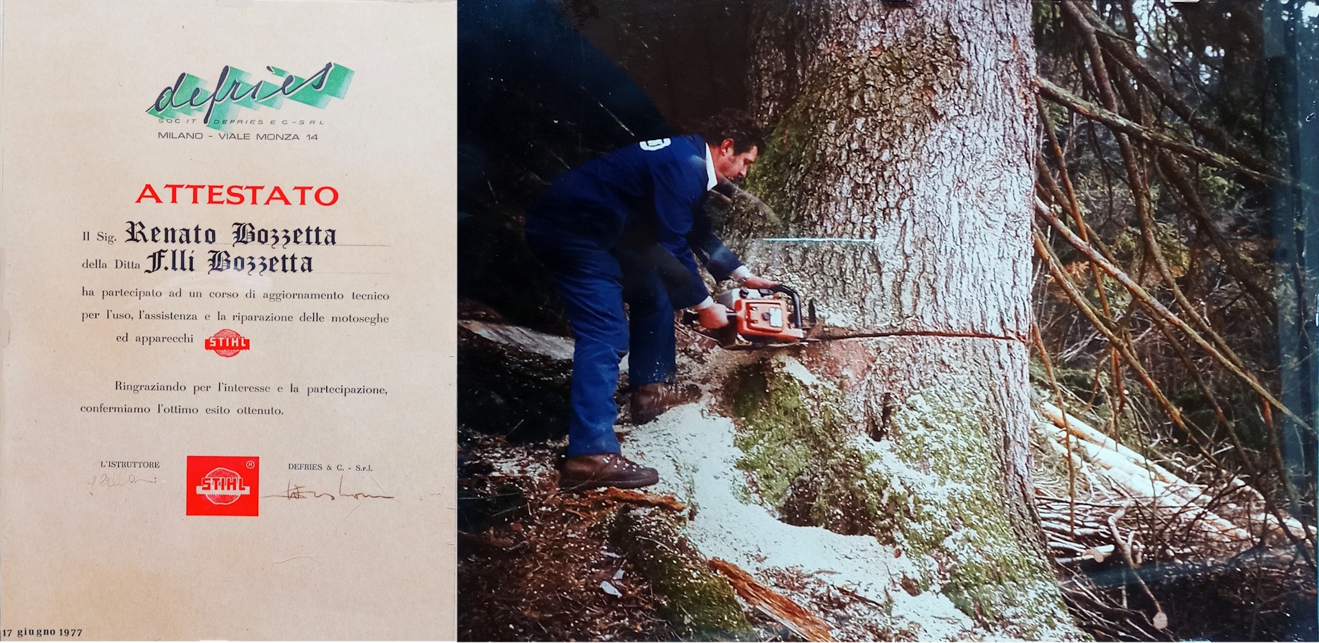 Poi Bozzetta Renato (classe 1935) partito con auto e motociclette, iniziò la sua passione per le motoseghe con l’arrivo in Val di Fiemme delle prime motoseghe negli Anni 50… dalla BEBO, la gamma McCulloch, le Stihl Contra 070-090 07 08, alle quali seguirono negli Anni 60 le Sachs-Dolmar CA CC CF CP, le Pioneer P20 P40 P50, le Husqvarna 70 e 90, ecc…